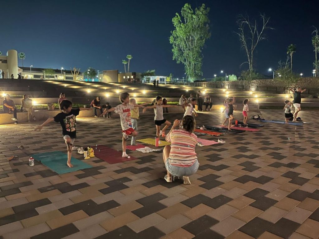 Ese mismo día, niñas y niños disfrutaron de una sesión de yoga al atardecer, diseñada para promover el bienestar físico y emocional en un espacio abierto y relajado.