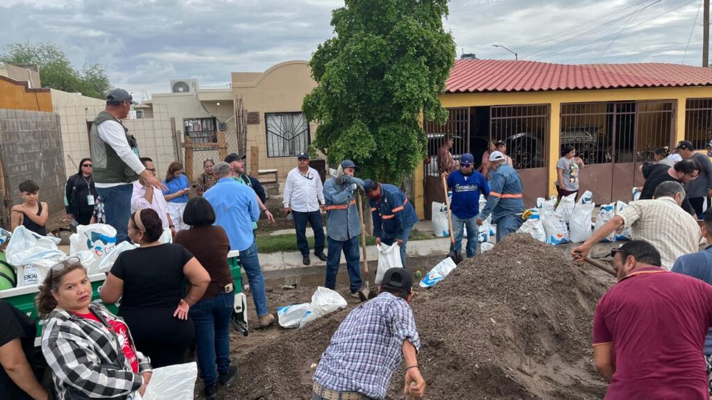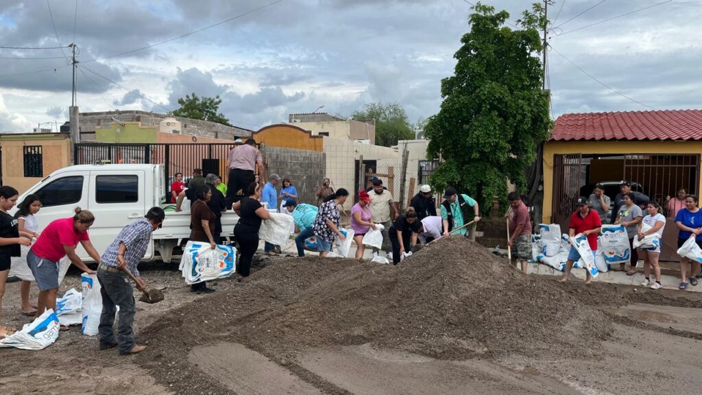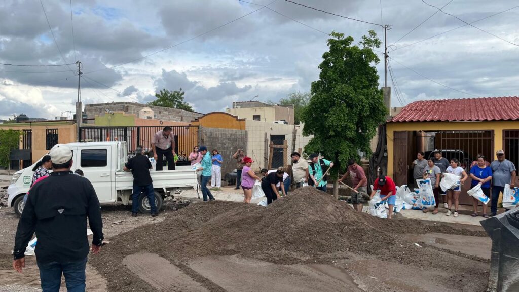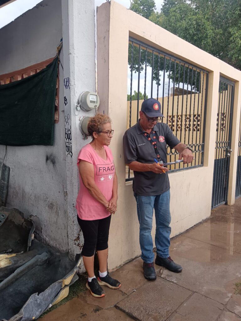 Hermosillo, Sonora; 3 de septiembre, 2025.- Personal de diferentes dependencias del Ayuntamiento de Hermosillo se reunió con residentes de La Caridad, cuyas viviendas se inundaron, con quienes acordaron protocolos de actuación y a quienes se les recomendó evacuar la zona ante el pronóstico de más lluvias durante los próximos días.