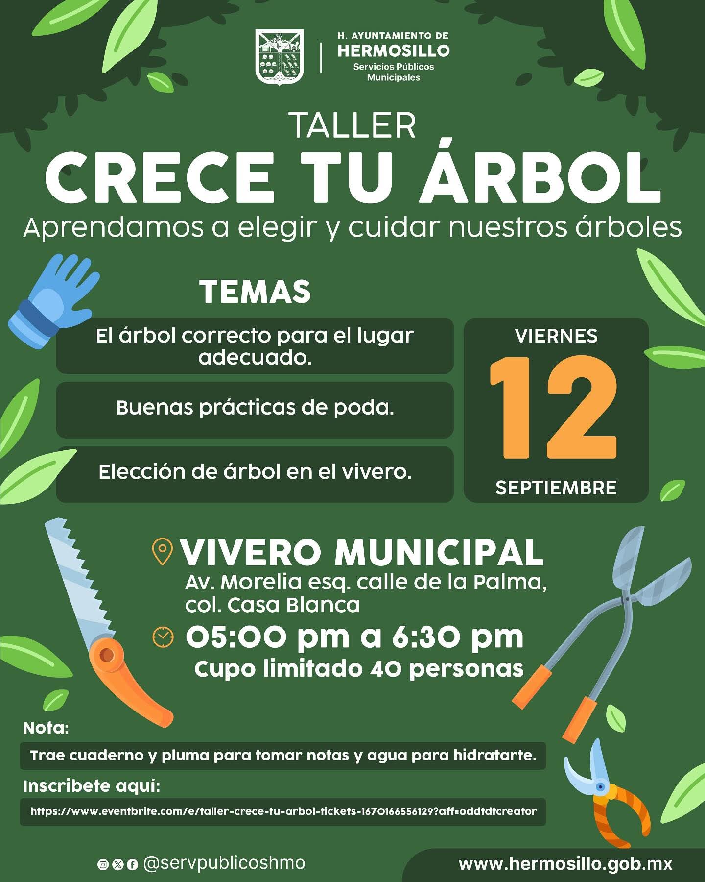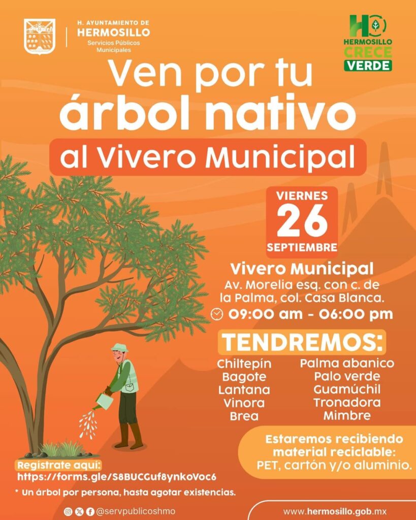 Hermosillo, Sonora; 24 de septiembre de 2025.-El Ayuntamiento de Hermosillo, a través de Servicios Públicos Municipales, invita a la ciudadanía a participar en la entrega de árboles nativos que se llevará a cabo este viernes 26 de septiembre en el Vivero Municipal.