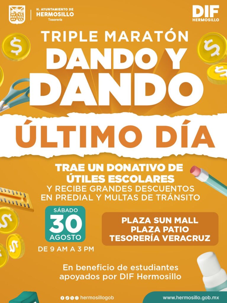 Hermosillo, Sonora; 27 de agosto de 2025.- Tesorería Municipal en coordinación con DIF Hermosillo, invita a la ciudadanía a sumarse al Triple Maratón del programa “Dando y Dando”, que se llevará a cabo este sábado 30 de agosto en un horario de 9:00 a 15:00 horas.
