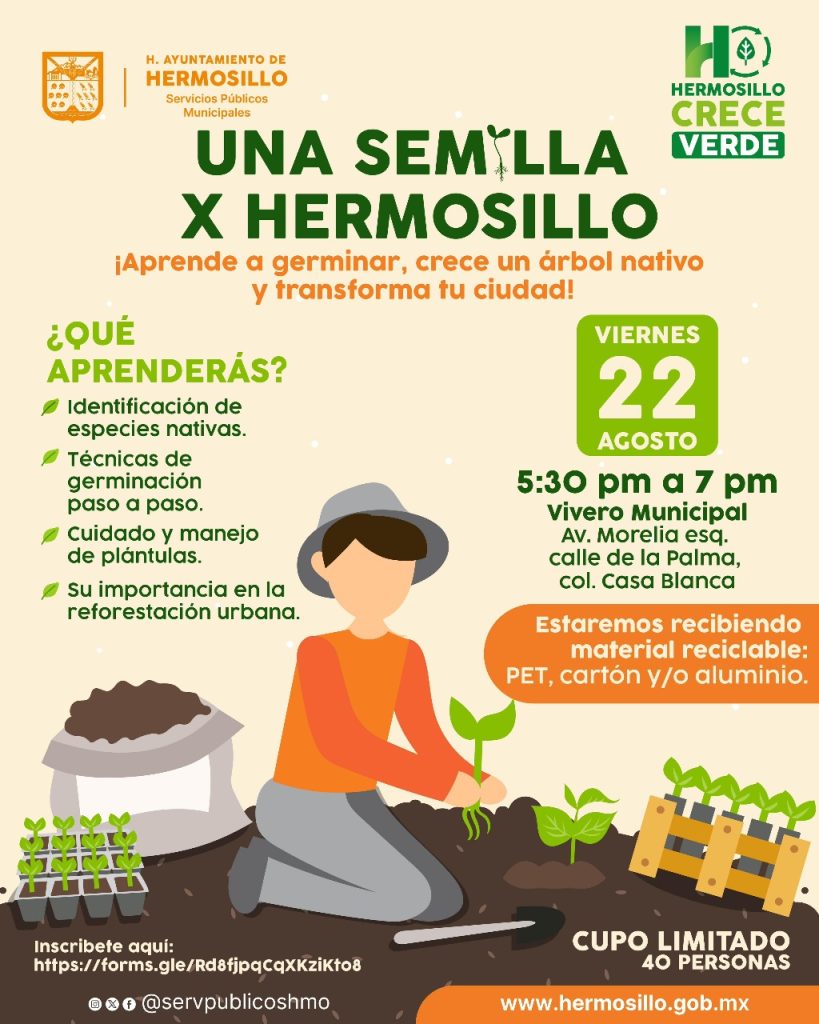 Hermosillo, Sonora; 20 de agosto de 2025.-El Ayuntamiento de Hermosillo, a través de Servicios Públicos Municipales, invita a la ciudadanía a participar en el taller “Una Semilla x Hermosillo”, que se llevará a cabo este viernes 22 de agosto en el Vivero Municipal.