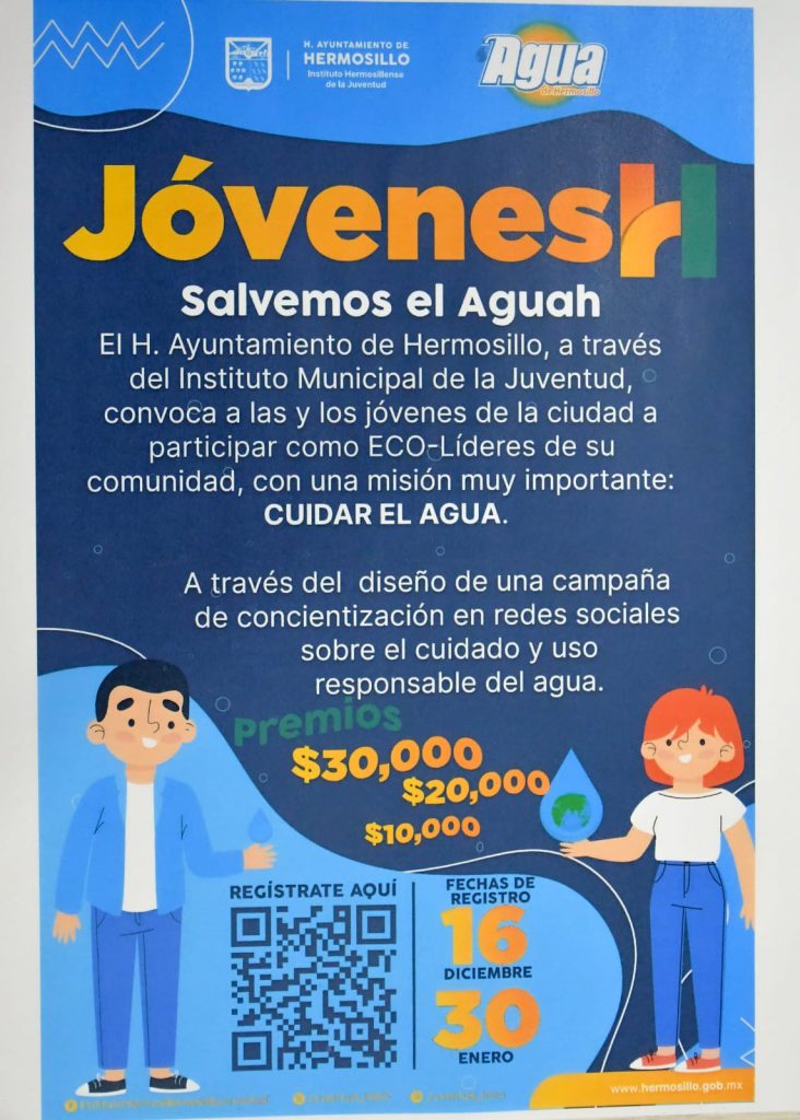 Hermosillo, Sonora; 14 de enero, 2025.- Las y los residentes de Hermosillo de entre 15 y 29 años de edad, tienen oportunidad de confirmarse como eco líderes de su comunidad mediante el diseño de una campaña de concientización en redes sociales sobre el uso responsable del agua con la convocatoria “Jóvenes H Salvemos el Agua “.