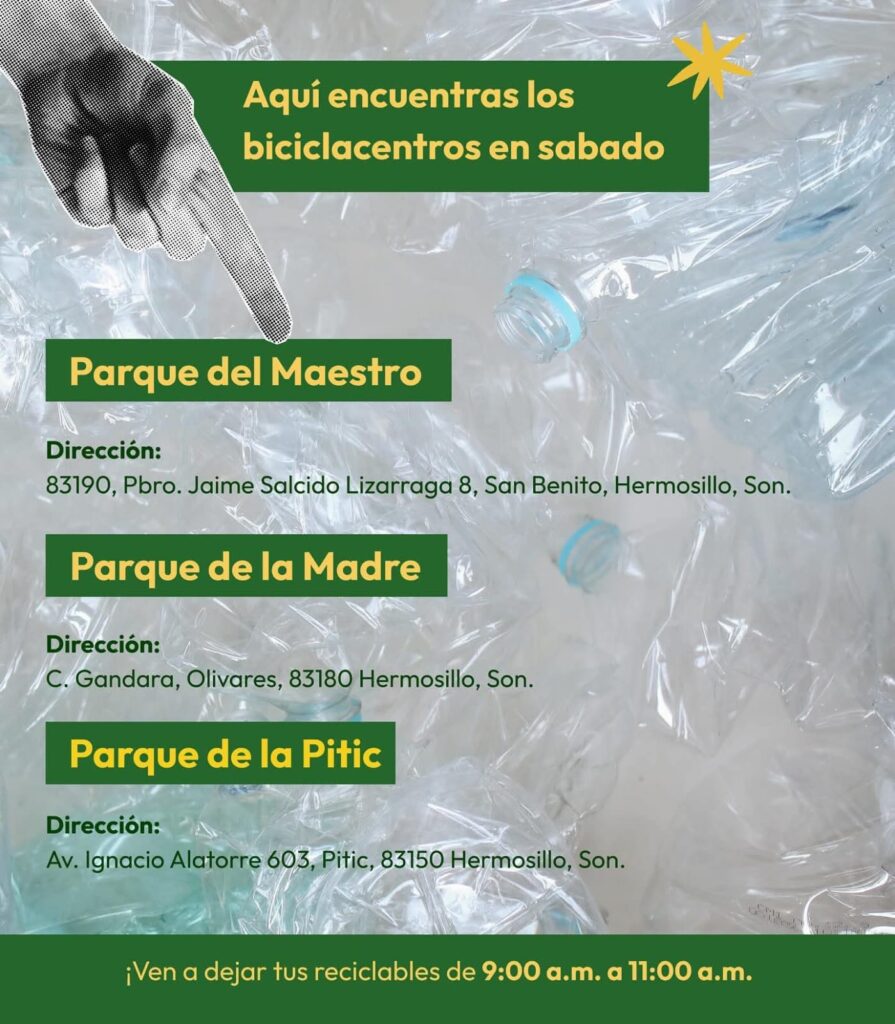 Hermosillo, Sonora; 26 de septiembre de 2025.-Como parte de las estrategias para consolidar la cultura del reciclaje en Hermosillo, el Gobierno Municipal y quienes colaboran desde la sociedad civil con el programa Biciclando, tienen a disposición de la ciudadanía 3 puntos de acopio de materiales reciclables los días sábados.