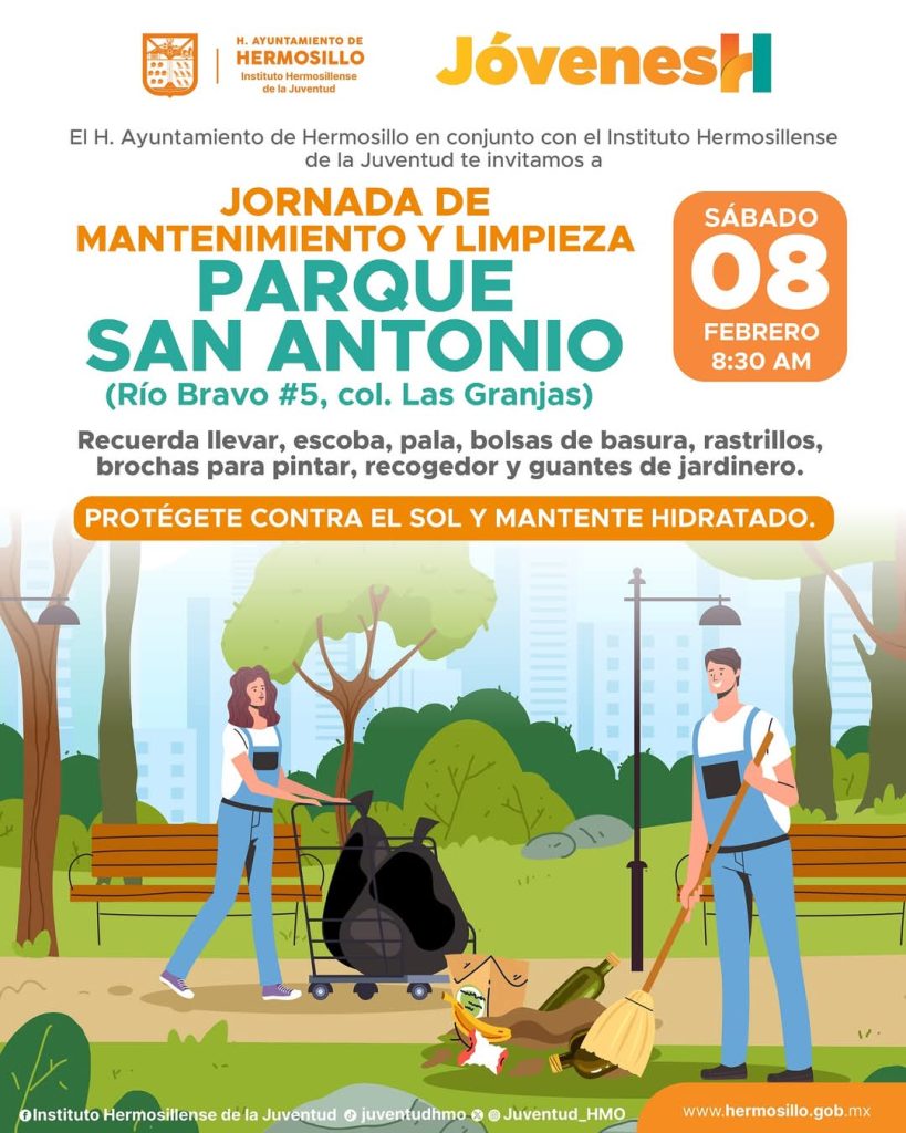 Hermosillo, Sonora; 29 de enero, 2025.- Una jornada de mantenimiento y limpieza en el Parque San Antonio de la colonia Las Granjas realizará el Instituto Hermosillense de la Juventud (IHJ) este sábado 8 de febrero a partir de las 8:30 am por lo que la ciudadanía está invitada a sumarse a dicha actividad.