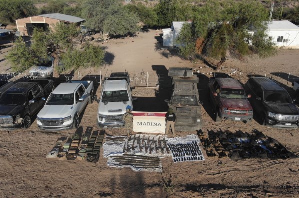 Pitiquito, Sonora; 29 de agosto de 2024.- En seguimiento al operativo por el ataque a un ganadero de la región, autoridades que integran la Mesa Estatal de Seguridad aseguraron un predio, un vehículo tipo “monstruo”, 13 vehículos, arsenal de armas de fuego y equipo táctico.