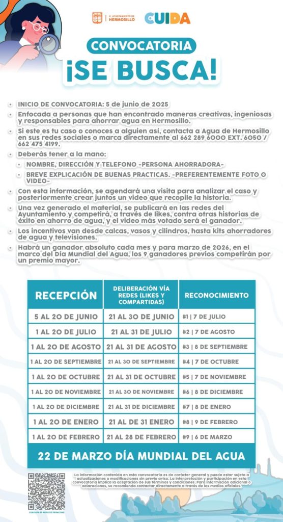 Hermosillo, Sonora; 22 de agosto de 2025.- Agua de Hermosillo cerró la tercera etapa de la convocatoria Se Busca, correspondiente al mes de agosto, con la recepción de cuatro videos testimoniales en los que personas creativas e ingeniosas compartieron historias y propuestas de acciones para ahorrar agua en los hogares.