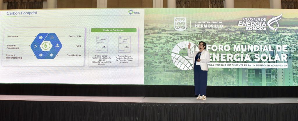 Hermosillo, Sonora; 5 de diciembre, 2024.- En el segundo día de actividades del Tercer Foro Mundial de Energía en Hermosillo, la empresa GCL System Integration Latinoamérica, presentó las últimas tendencias de la fabricación de módulos fotovoltaicos.