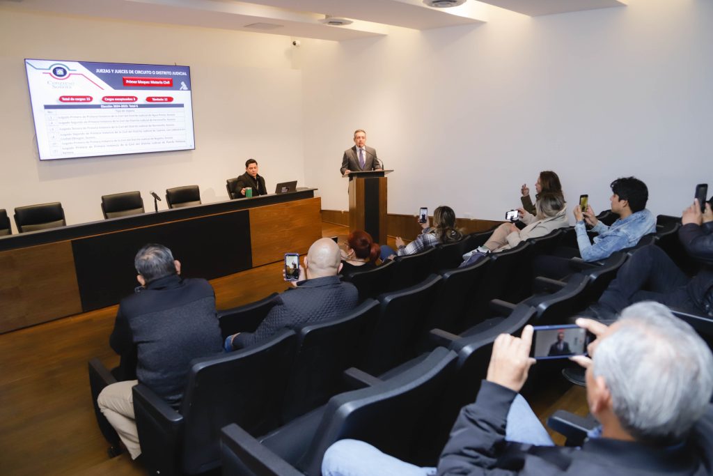 En rueda de prensa, detalló que en total se insacularon 45 cargos, los cuales incluyen tres magistraturas del Supremo Tribunal de Justicia, tres cargos de los Tribunales Colegiados Regionales de Circuito y del Tribunal Regional Unitario de Circuito, así como 39 juzgados en las materias civil, familiar, penal, mercantil y mixta.