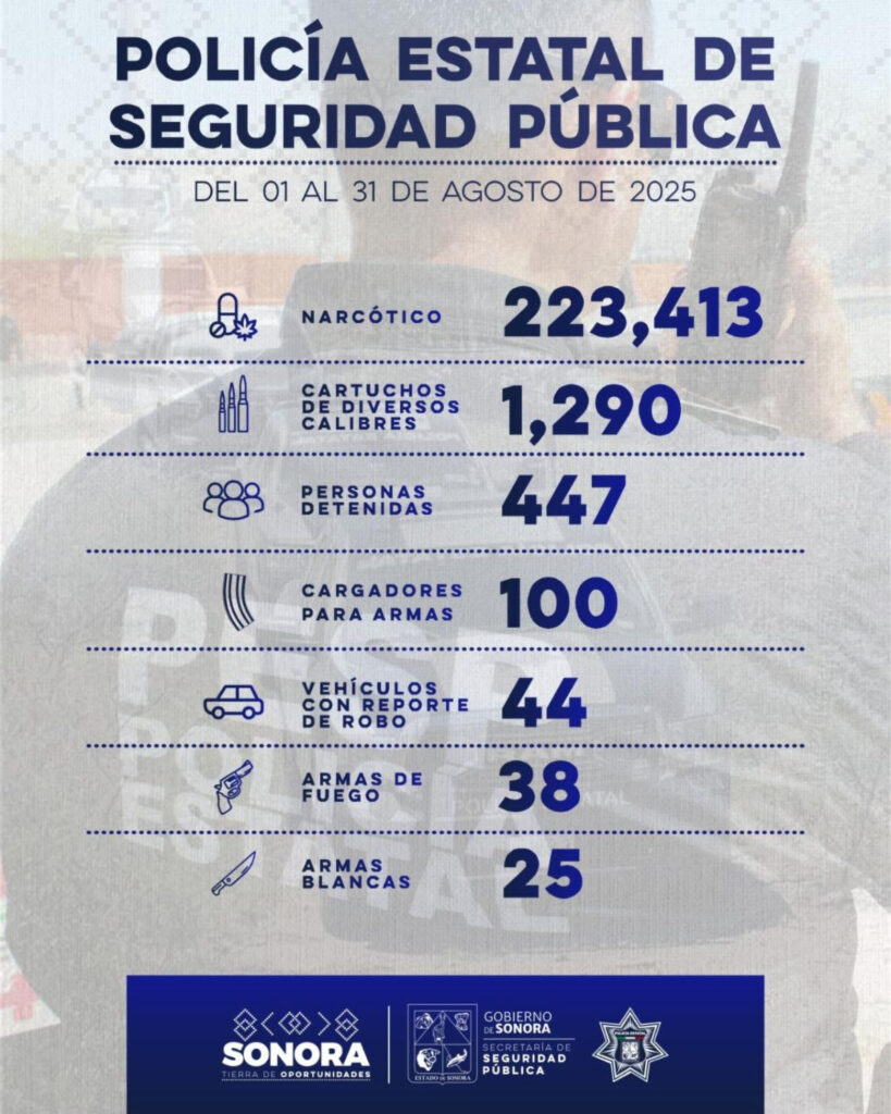 Hermosillo, Sonora; 1 de septiembre de 2025.- Con trabajo operativo de la Secretaría de Seguridad Pública (SSP) del Gobierno de Sonora, se lograron resultados contra el delito, registrándose durante agosto la detención de 447 personas en municipios del estado.