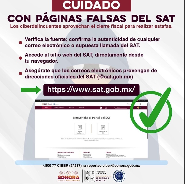 Hermosillo, Sonora; 7 de abril de 2025.- Para evitar que contribuyentes y el público en general sean víctimas de estafas y fraudes a través de páginas web y correos electrónicos que suplantan la identidad del Sistema de Administración Tributaria (SAT), la Unidad Cibernética de la Secretaría de Seguridad Pública (SSP) de Sonora recomendó extremar las medidas de prevención.