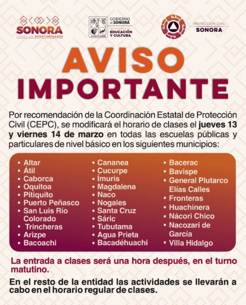 Especificó que los municipios donde se aplicará dicha medida preventiva para proteger la salud de la comunidad escolar son: Altar, Átil, Caborca, Oquitoa, Pitiquito, Puerto Peñasco, San Luis Río Colorado, General Plutarco Elías Calles, Trincheras, Arizpe, Bacoachi y Cananea.