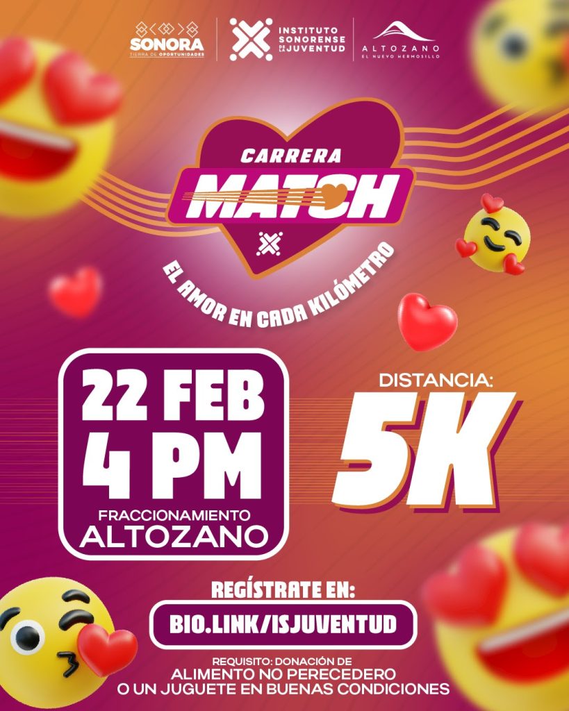 Hermosillo, Sonora; 14 de febrero de 2025.- El Gobierno de Sonora, a través del Instituto Sonorense de la Juventud (ISJ), invita a la comunidad a participar en la Carrera Match, que se llevará a cabo el próximo 22 de febrero a las 4:00 p.m. y que tiene como objetivo ofrecer un espacio deportivo y recreativo para las juventudes sonorenses, fomentando la convivencia y el bienestar.