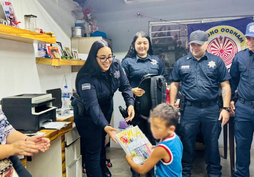Oficiales de la Policía Estatal de Seguridad Pública (PESP) de las diferentes bases operativas se organizaron y adquirieron materiales con sus propios recursos para distribuirlos en beneficio de la niñez de las comunidades de General Plutarco Elías Calles, Puerto Peñasco, Pitiquito, Hermosillo, Caborca y otros municipios, previo al regreso a clases.