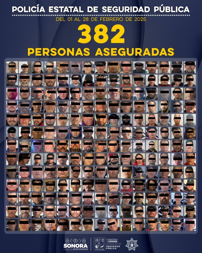Hermosillo, Sonora; 3 de marzo de 2025.- Durante operativos de febrero, la Secretaría de Seguridad Pública (SSP) realizó la detención de 382 personas, como resultado de las acciones de prevención y combate al delito en coordinación con autoridades de seguridad de los tres niveles de gobierno en municipios de Sonora.