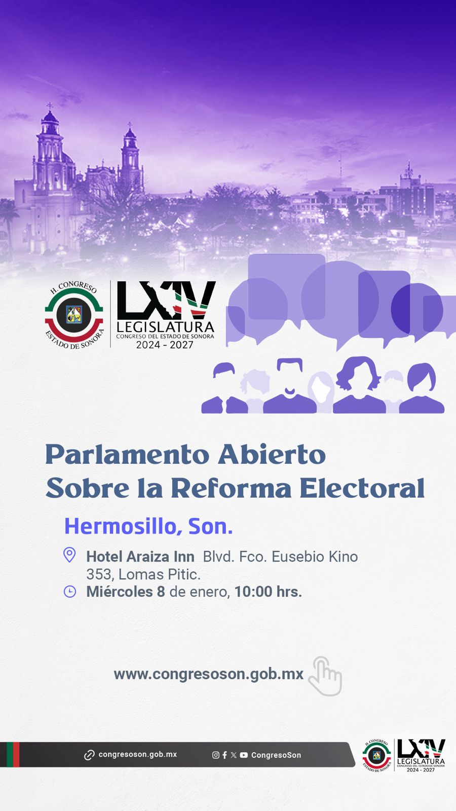 En Hermosillo estuvieron presentes los diputados Omar del Valle Colosio (PVEM), David Figueroa Ortega (PVEM), Norberto Barraza Almazán (PES), René García Rojo (PT) y Raúl González de la Vega, así como las diputadas Amairany Peña Escalante (PES) y Ana Gabriela Tapia Fonllem (PRD). También asistieron Nery Ruiz Arvizu, consejero presidente del Instituto Estatal Electoral y de Participación Ciudadana (IEE Sonora); Antonio Romero Peñuriri, representante de la Barra Sonorense de Abogados (BSA); Raúl Guillén, de la Barra Mexicana de Abogados, capítulo Sonora; además de diputados federales.