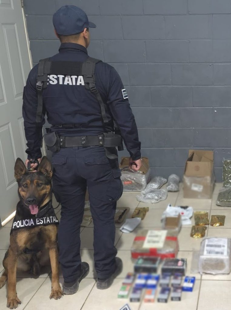 • Unidad K-9 de la Policía Estatal alertó para el aseguramiento de narcótico en diversos paquetes que estaban en una empresa de envíos de la ciudad.