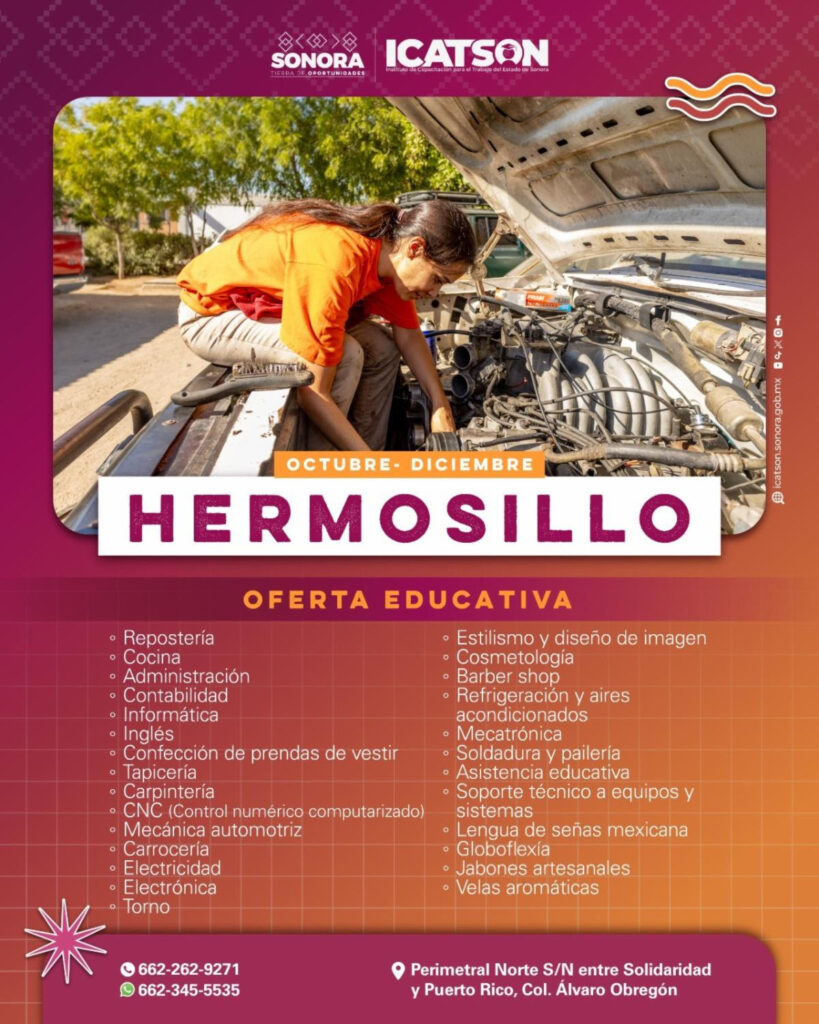 Hermosillo, Sonora; 29 de agosto de 2025.- El Gobierno de Sonora, a través del Instituto de Capacitación para el Trabajo del Estado de Sonora (Icatson), iniciará el próximo lunes 1 de septiembre su proceso de inscripciones correspondiente al periodo octubre-diciembre.