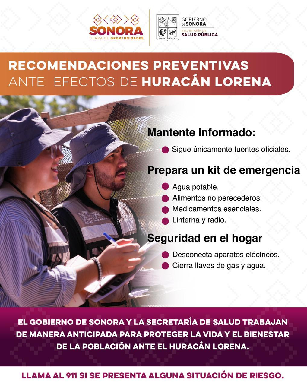 La Secretaría de Salud Pública de Sonora subraya que se encuentra preparada y trabajando de manera anticipada para proteger la salud de las y los sonorenses. Con estas acciones, el Gobierno de Sonora refrenda su compromiso de salvaguardar la vida, la salud y el bienestar de la población frente a la inminente llegada del huracán Lorena.