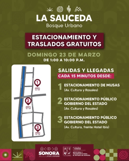 Carlos Sosa Castañeda, coordinador ejecutivo del Imtes, informó que los visitantes tendrán este domingo la opción de transporte gratuito, de ida y vuelta, en un horario de 13:00 a 22:00 horas. Las unidades saldrán cada 15 minutos desde tres puntos ubicados alrededor del Centro de Gobierno, donde también estarán disponibles tres estacionamientos sin costo para aparcar sus vehículos: el estacionamiento de Musas, ubicado en Avenida Cultura y Rosales; el estacionamiento público del Gobierno de Sonora en Avenida Cultura y Rosales; y otro estacionamiento público del Gobierno de Sonora en Avenida Cultura y Galeana, frente al Hotel Ibis.