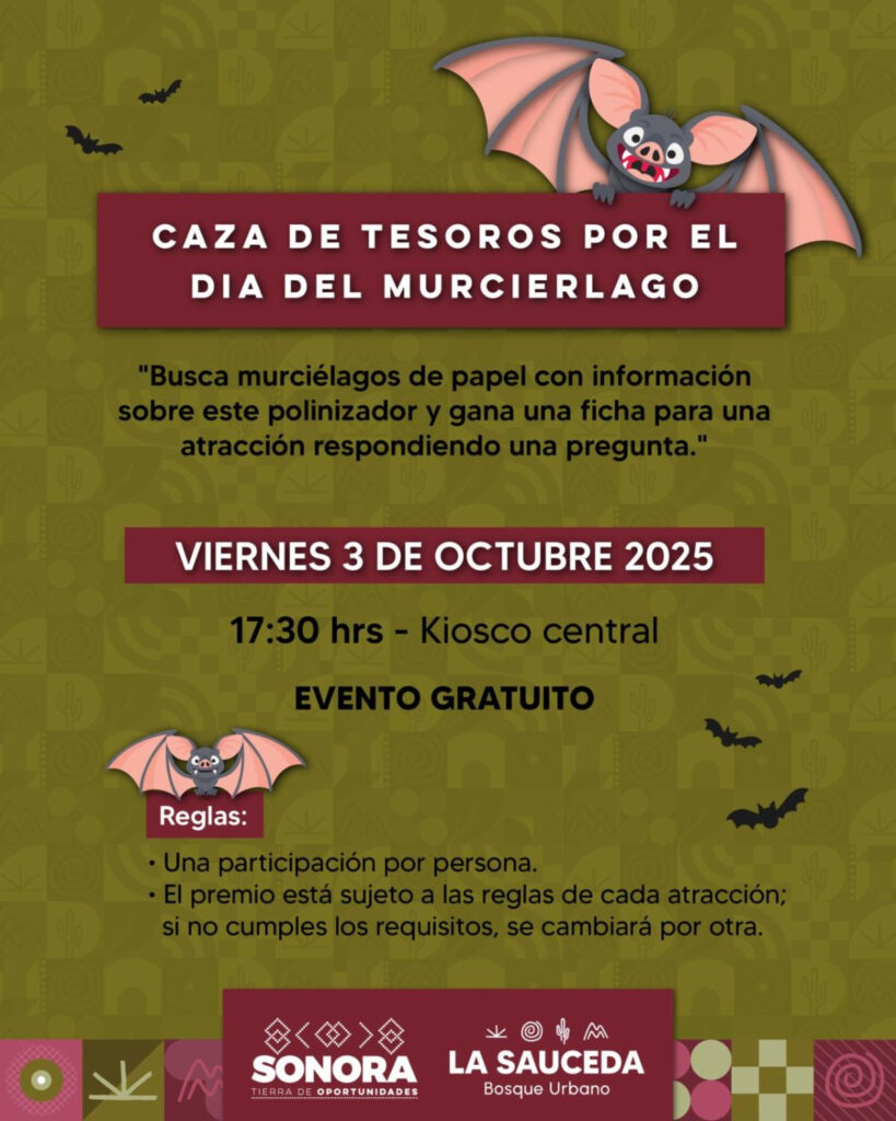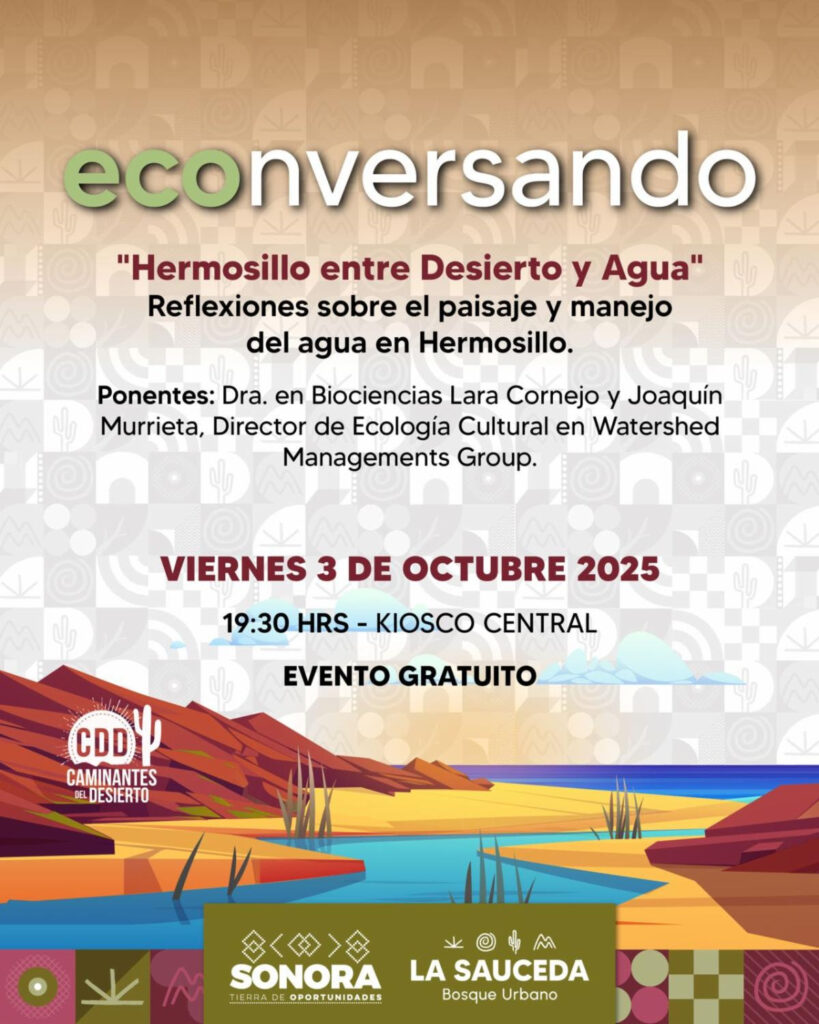 Las actividades darán inicio este viernes 3 de octubre con la Caza de tesoros por el Día del Murciélago, pensada para toda la familia, y con la charla Econversando: “Hermosillo entre el Desierto y el Agua”, en colaboración con Caminantes del Desierto. En esta sesión participarán Lara Mercado de BioCiencias y Joaquín Murrieta, director de Ecología Cultural en Watershed Management Group.