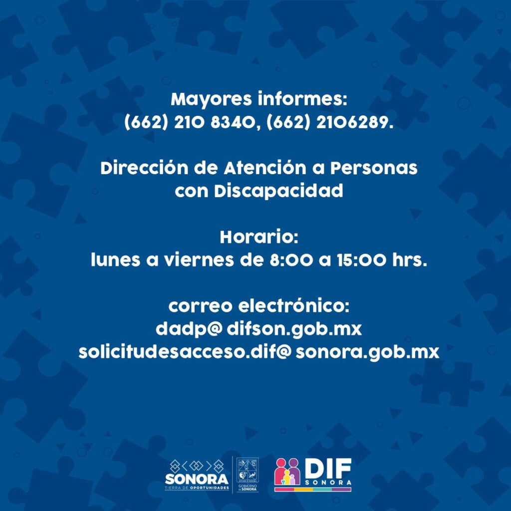Para mayor información, el sistema DIF Sonora pone a su disposición los teléfonos (662) 210 8340 y (662) 210 6289 de la Dirección de Atención a Personas con Discapacidad, en horario de 8:00 a 15:00 horas, de lunes a viernes, o en el DIF del municipio que le corresponda.