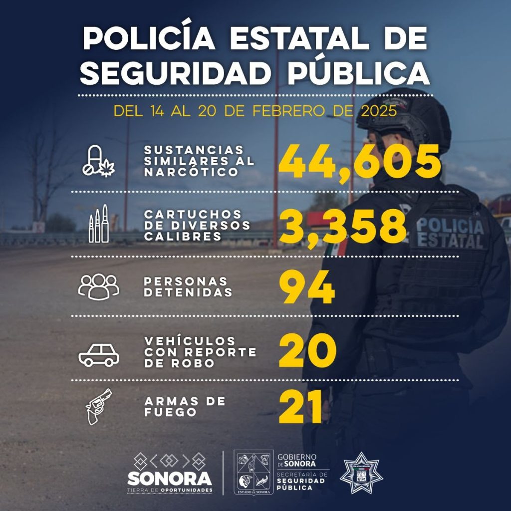 Hermosillo, Sonora; 21 de febrero de 2025.- Con el trabajo operativo de una semana en municipios de Sonora, la Secretaría de Seguridad Pública (SSP), a través de la Policía Estatal de Seguridad Pública (PESP) realizó la detención de 94 personas.