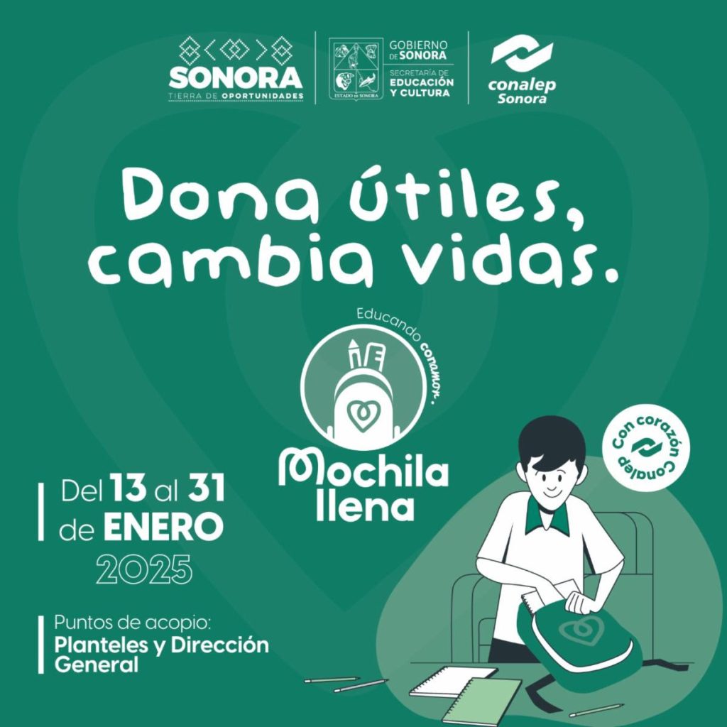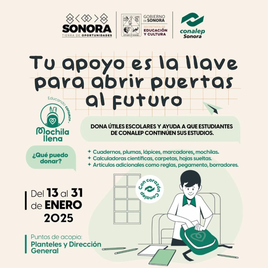 Hermosillo, Sonora; 14 de enero de 2025.- Con la finalidad de fomentar el altruismo y la solidaridad en beneficio del alumnado del Colegio de Educación Profesional Técnica del Estado de Sonora (Conalep), el subsistema invita a participar en el programa “Mochila Llena: Educando CONAmor”, informó Luisa Cristina Rodríguez Ibarra.