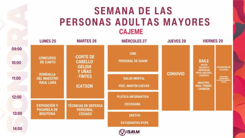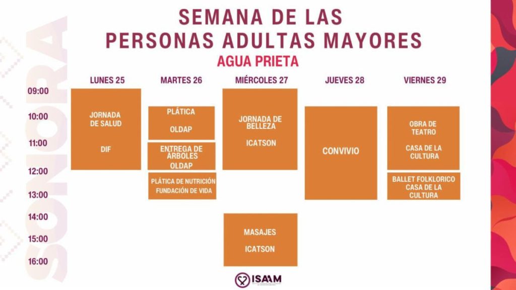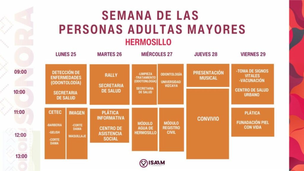 Hermosillo, Sonora; 23 de agosto de 2025.- Para acercar servicios y garantizar un acceso equitativo a la información y programas públicos, el Instituto Sonorense para la Atención de los Adultos Mayores (ISAAM) llevará a cabo la Semana de las Personas Adultas Mayores, en el marco del Día Nacional de las Personas Adultas Mayores.