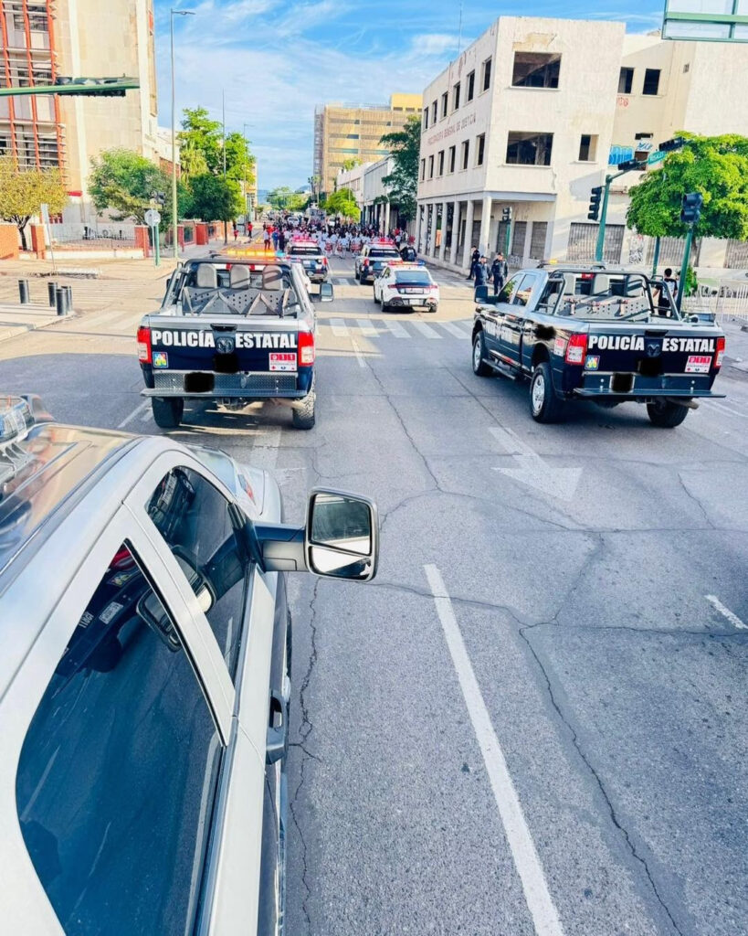 Oficiales de la Policía Estatal de Seguridad Pública (PESP) acompañaron a miles de estudiantes, familias en Hermosillo y comunidades rurales durante eventos cívicos y desfiles, con el propósito de garantizar su seguridad durante las festividades patrias.