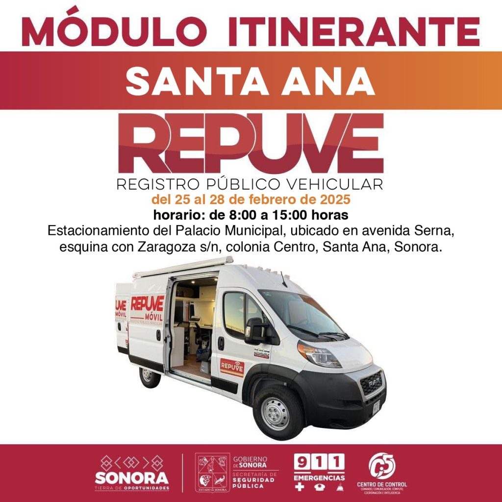 Hermosillo, Sonora; 24 de febrero de 2025.- Del 25 al 28 de febrero el módulo itinerante del Registro Público Vehicular (Repuve) estará instalado en Santa Ana como parte de las acciones para apoyar a la ciudadanía interesada en regularizar sus vehículos usados de procedencia extranjera.
